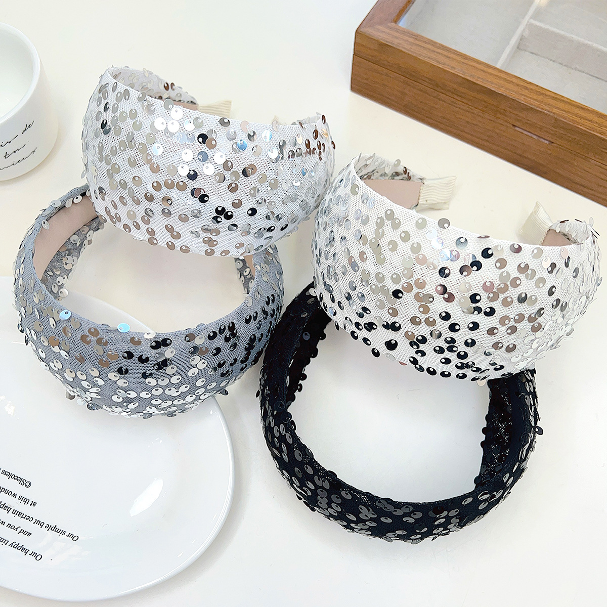 Black + sequins + wide-brimmed headband